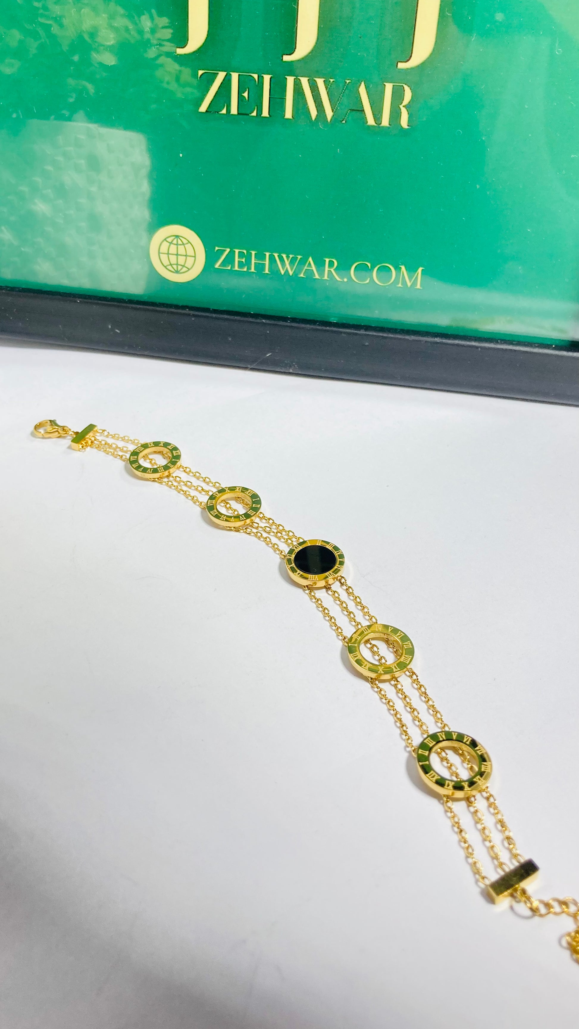 The Eterna Roman Charm Bracelet is a symbol of timeless beauty and elegance. Crafted with a delicate double gold chain, it features circular charms adorned with Roman numeral engravings in striking green, white, and black enamel accents. The harmonious blend of colors and classic design makes this bracelet a versatile piece—perfect for elevating everyday style or adding a refined touch to evening wear.