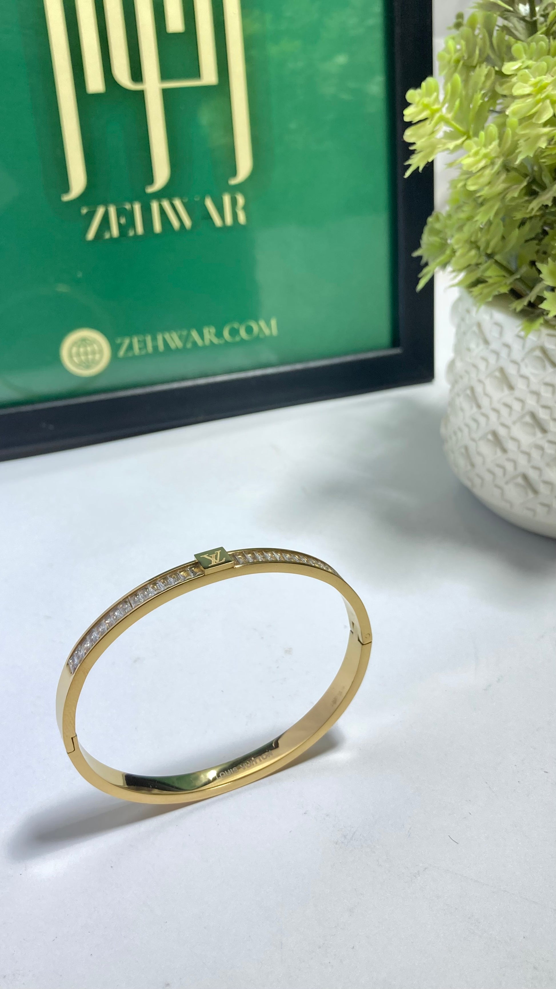 Add a touch of timeless sophistication with the Louis Vuitton Crystal Charm Bangle. Designed in a sleek gold-tone finish, this elegant piece is adorned with a row of sparkling crystals, channel-set to perfection. The signature LV emblem on the clasp makes it instantly iconic, while the refined design ensures it pairs beautifully with both casual and formal looks. A statement of luxury and elegance, this bangle is a must-have addition to your collection.