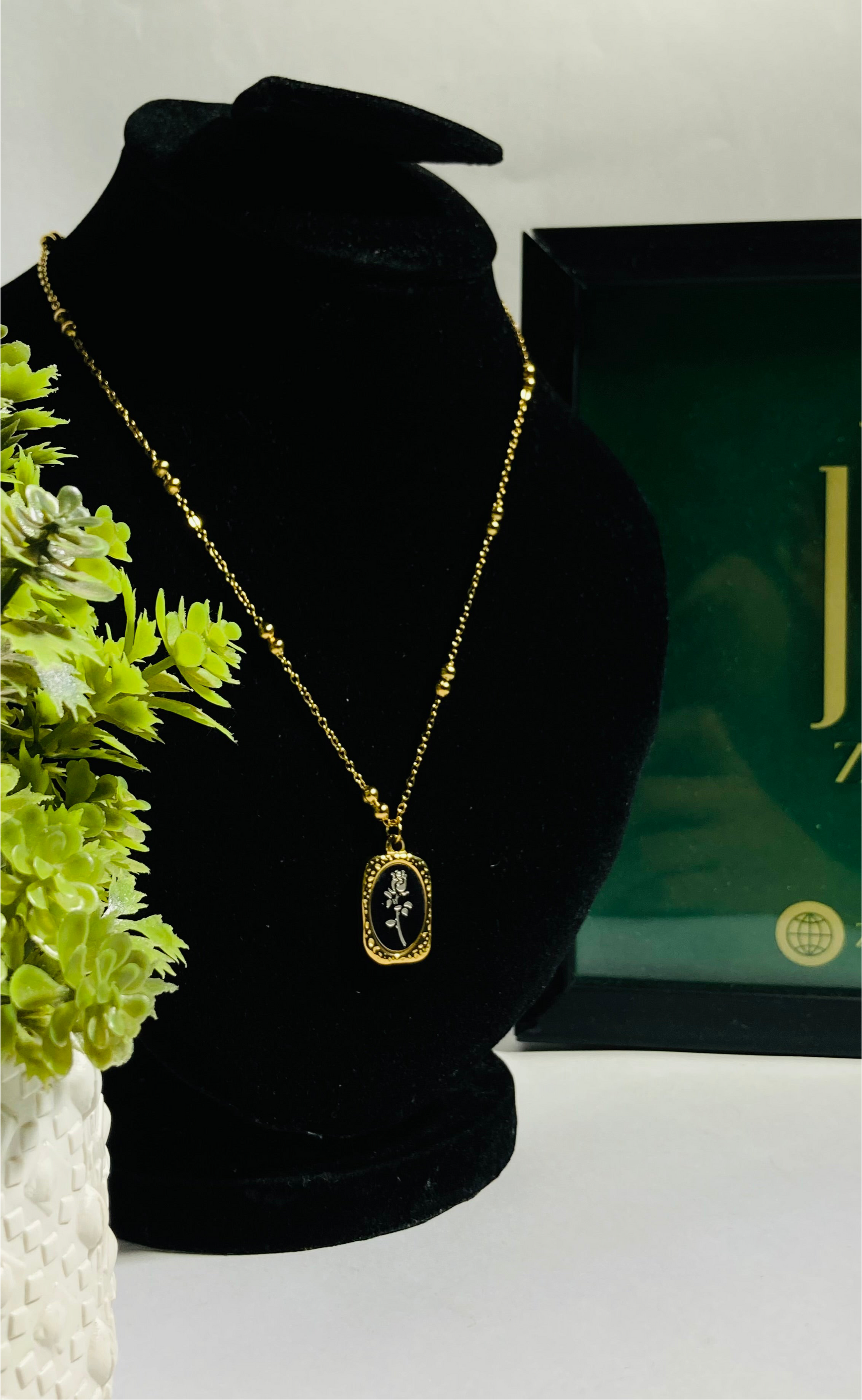 A symbol of mystery and elegance. This exquisite piece features a golden frame embracing a deep black backdrop, adorned with a delicate rose motif. The contrast of midnight tones with radiant gold captures the beauty of a rose blooming under twilight skies, making it a perfect accessory for those who embrace grace, strength, and timeless charm.